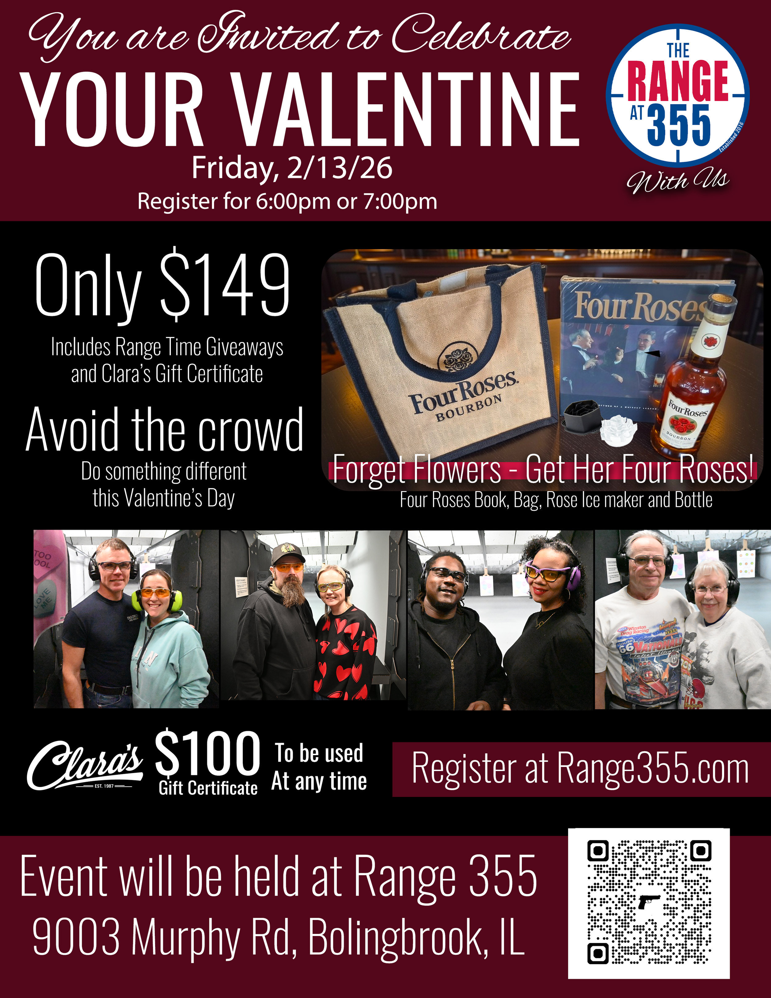 Package includes: Range time, Four roses Ice maker, Four Roses bottle Four Roses bag and Four Roses book as well as a $100 gift card from Clara’s!